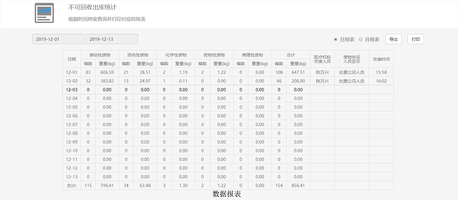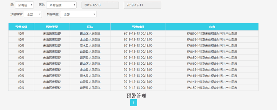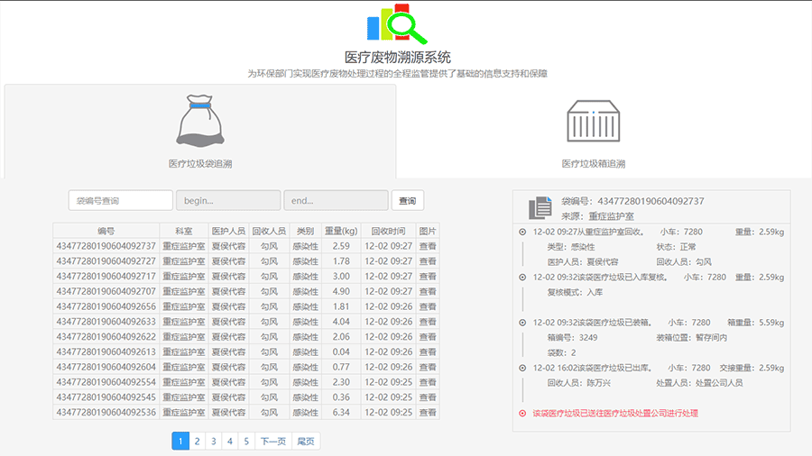 醫(yī)療廢物閉環(huán)監(jiān)管系統(tǒng)平臺(tái)具備醫(yī)廢追溯管理、科室交接管理、清運(yùn)人員工作量統(tǒng)計(jì)、醫(yī)廢報(bào)表、醫(yī)廢定位等功能;其中醫(yī)廢追溯管理對(duì)每天的醫(yī)療廢物收集處置現(xiàn)場(chǎng)可實(shí)時(shí)查看,登記的信息簡(jiǎn)單直觀可查,及時(shí)發(fā)現(xiàn)問(wèn)題,解決問(wèn)題;醫(yī)廢桶定位可以實(shí)時(shí)了解廢物的滿(mǎn)桶情況,及時(shí)通知對(duì)應(yīng)的樓層清運(yùn)人員進(jìn)行收集,以免醫(yī)療廢物滿(mǎn)溢;醫(yī)廢報(bào)表是一份完整的數(shù)據(jù)分析及數(shù)據(jù)報(bào)表系統(tǒng),方便分管領(lǐng)導(dǎo)精準(zhǔn)快捷的核對(duì)醫(yī)廢處置信息,確保醫(yī)廢不流失。